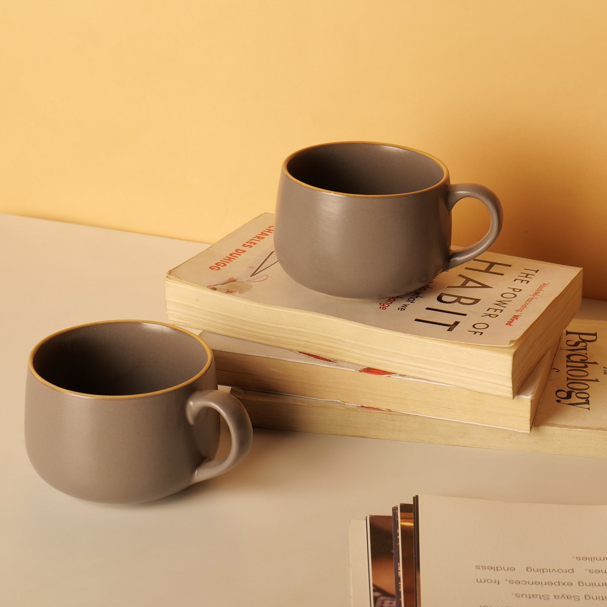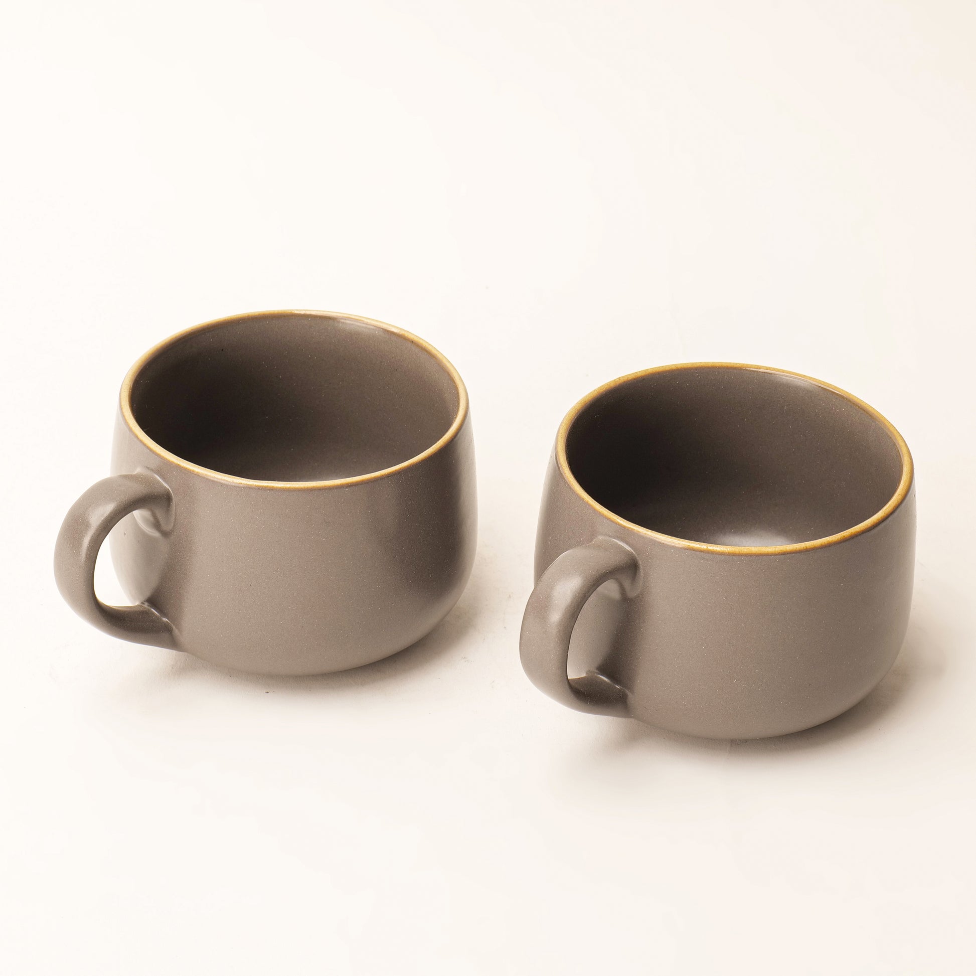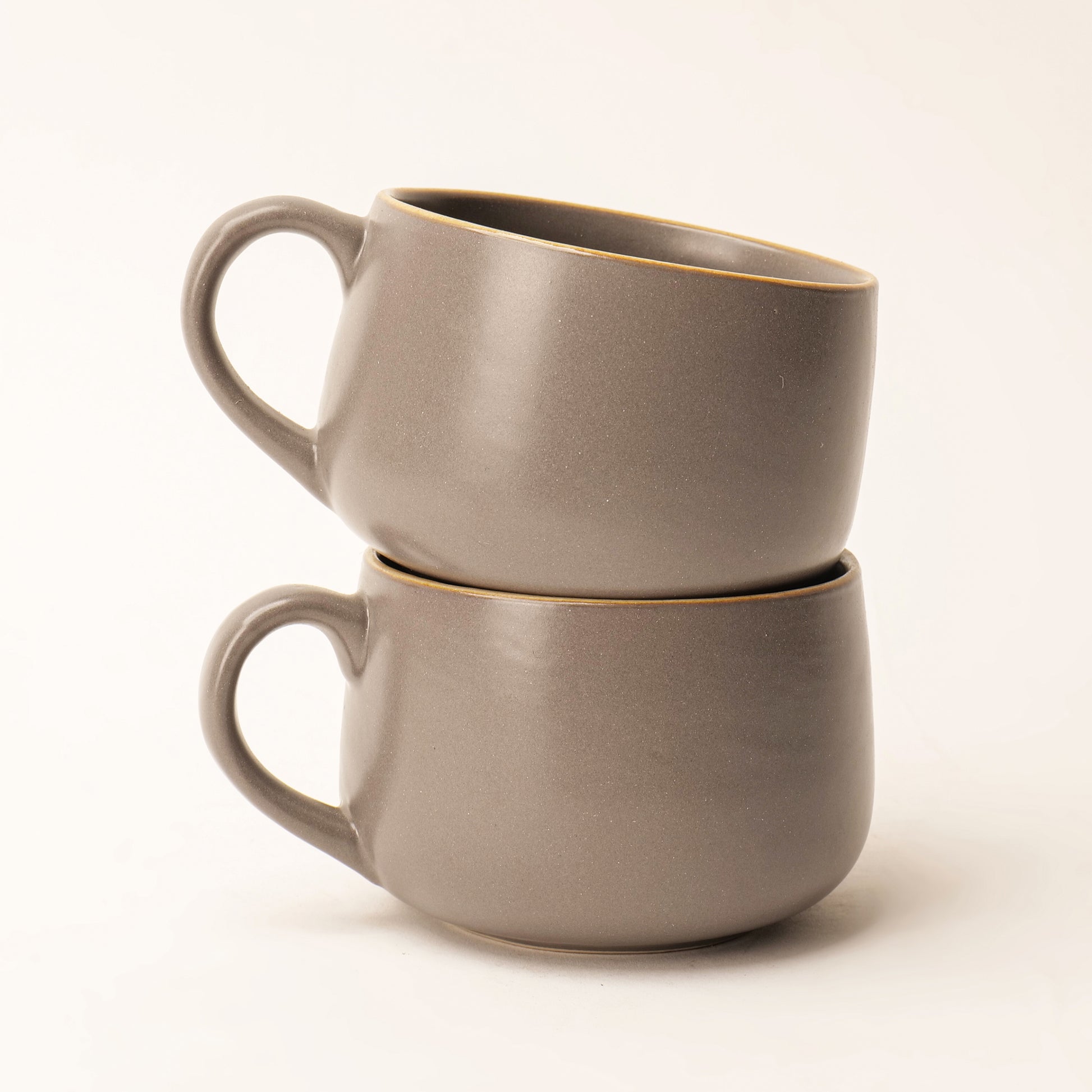 With a soft matte grey body and subtle golden-brown rim, these mugs bring a sense of grounded warmth to your table. Their round form feels snug in your palms, like a hug in ceramic. Whether it's your evening brew, a bedtime hot chocolate, or a soulful chat, this set of two makes space for connection.
