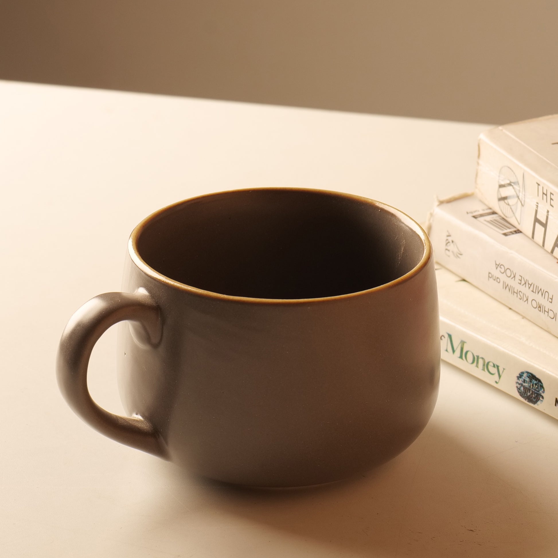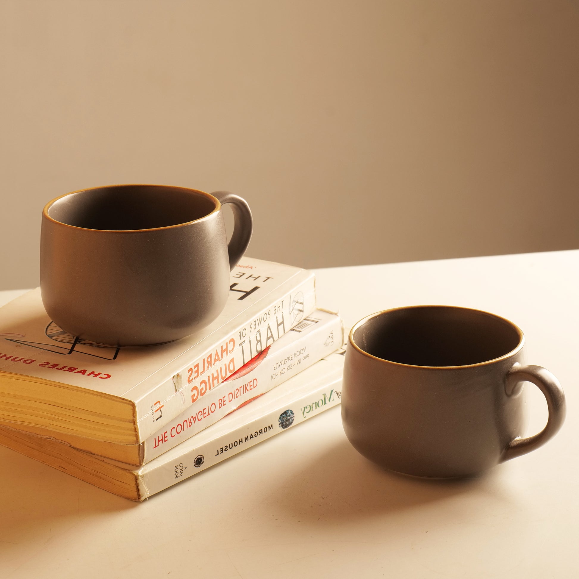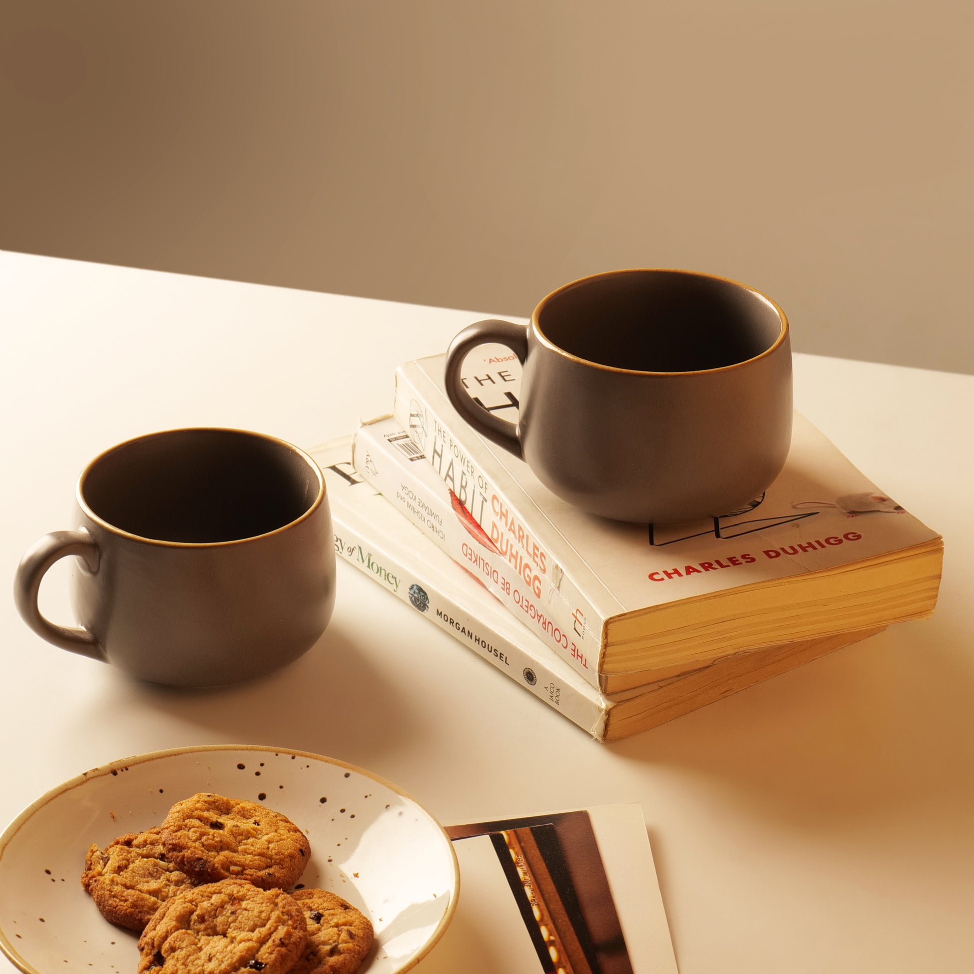 With a soft matte grey body and subtle golden-brown rim, these mugs bring a sense of grounded warmth to your table. Their round form feels snug in your palms, like a hug in ceramic. Whether it's your evening brew, a bedtime hot chocolate, or a soulful chat, this set of two makes space for connection.